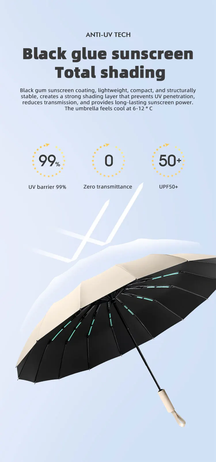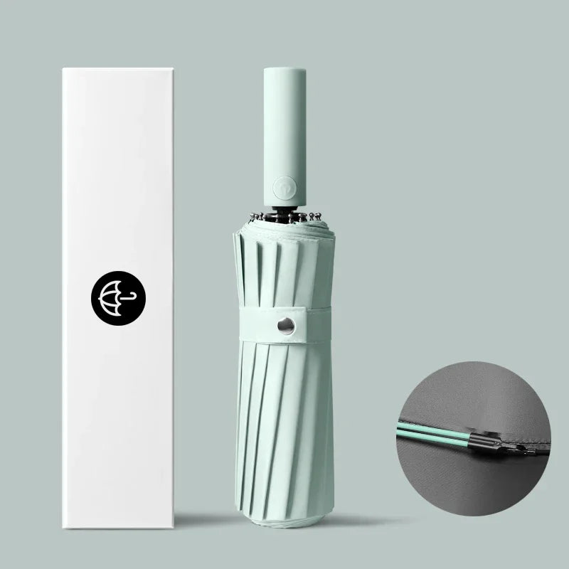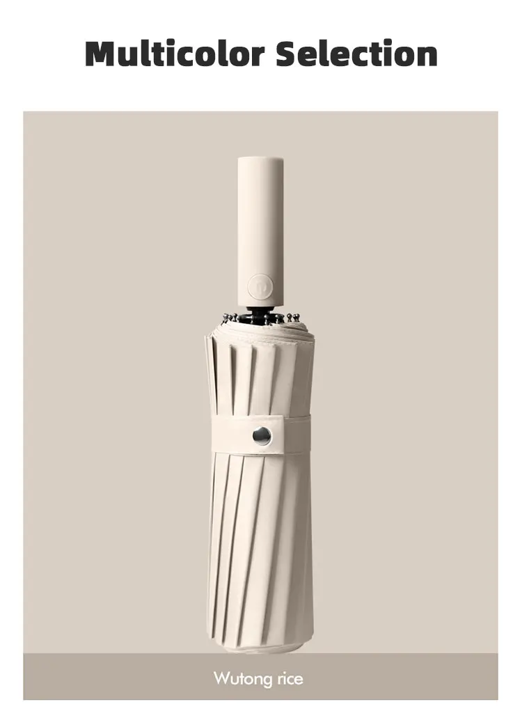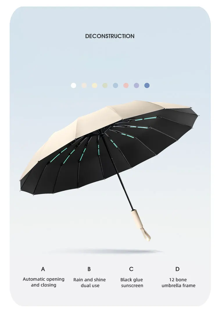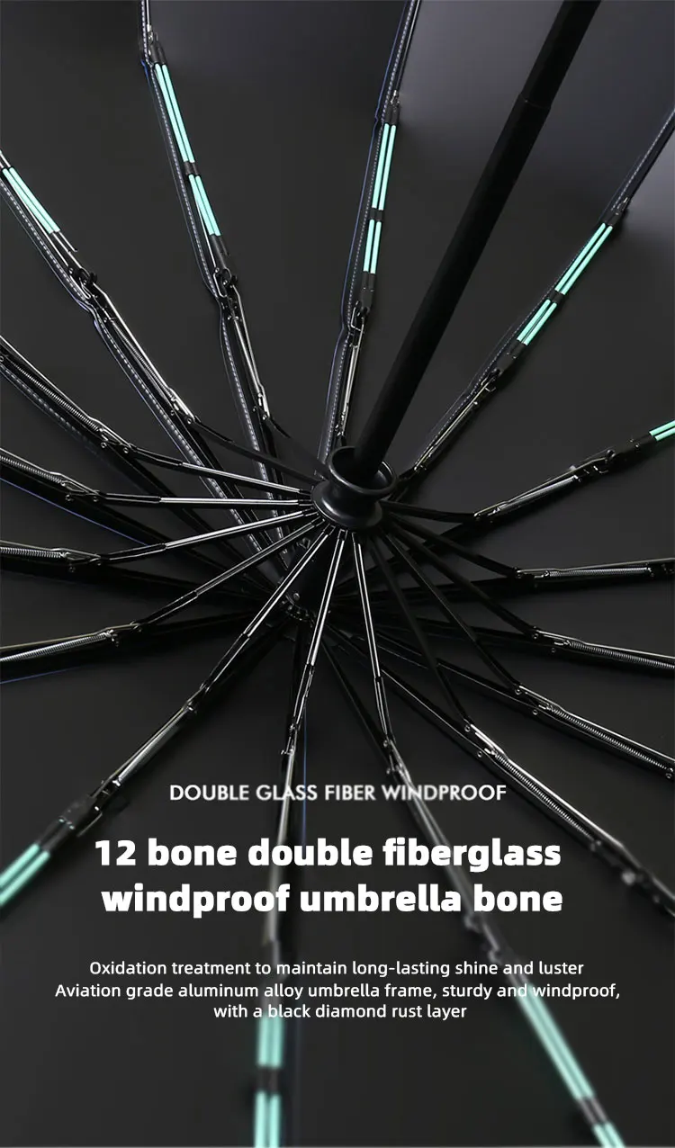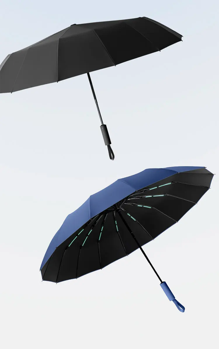 2. Conception coupe-vent à 16 côtes: le parapluie est conçu avec 16 côtes, offrant une plus grande stabilité et résistance au vent, l'empêchant de se retourner par vent fort.
