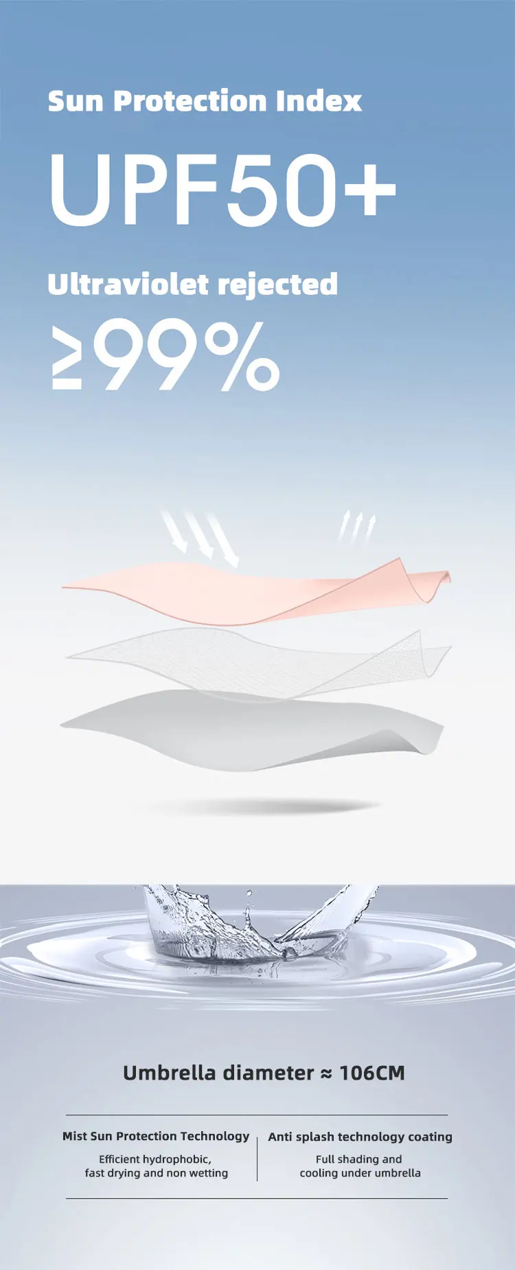 6. Double usage pour le soleil et la pluie: le parapluie est polyvalent et peut être utilisé pour la protection contre le soleil et la pluie, offrant commodité et praticité.