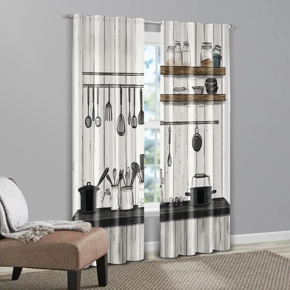 2 pièces rideaux cuisine, tissu imprimé 2D lavable en machine, sans tige, déco maison