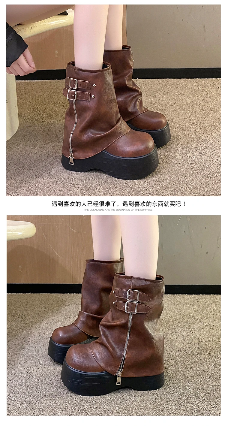 Bottines mi-mollet en cuir souple hiver automne haute plate-forme chaussons britanniques compensés femme nouvelles dames grosses bottes de moto 9CM
