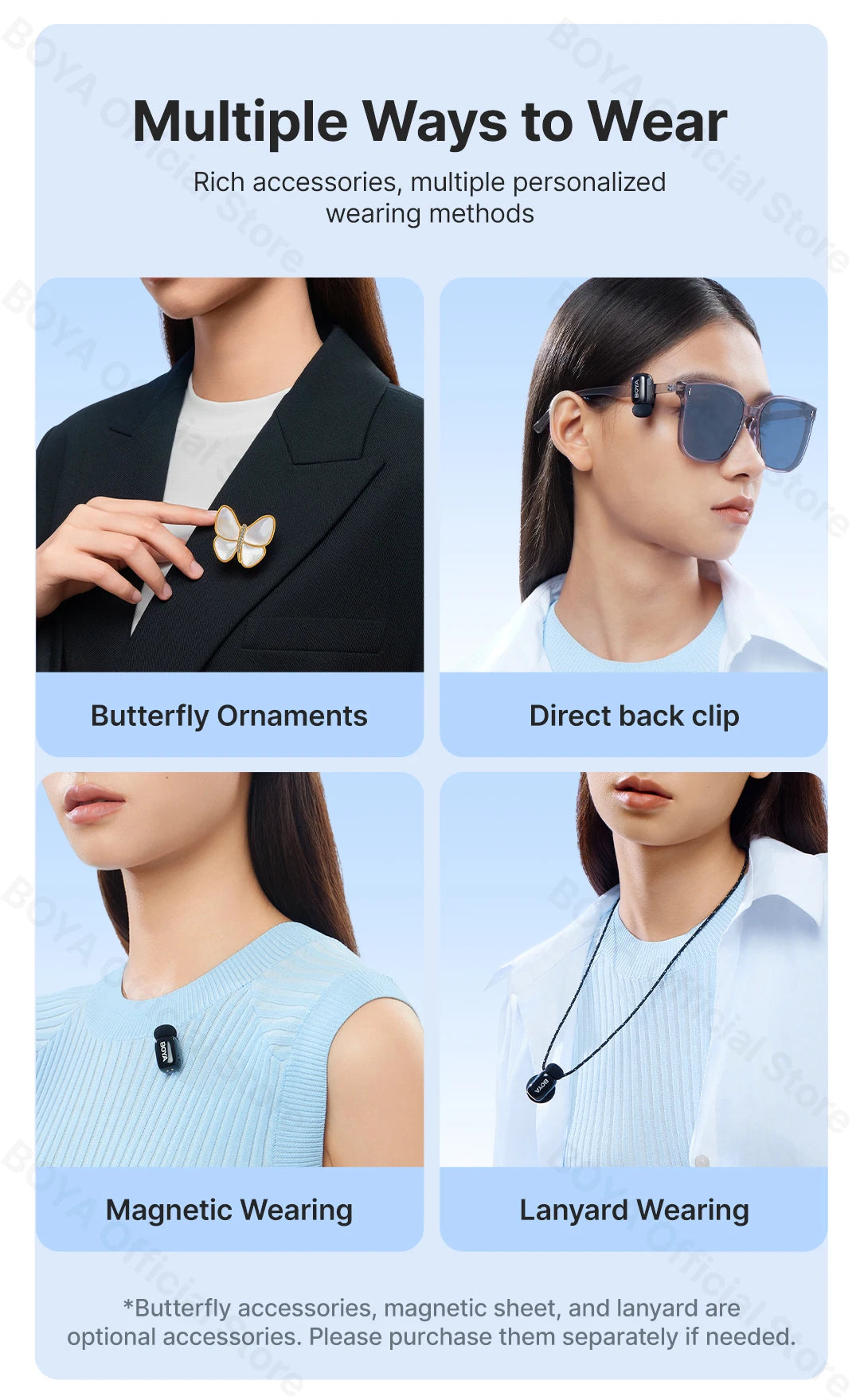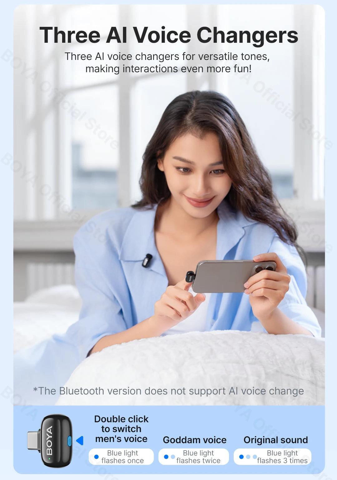 The BOYA mini, an ultra-compact and portable 2.4 GHz wirelessmicrophone system, features automatic re-connection and selectablenoise reduction that offer remarkable flexibility for recording.lt adoptsspecific Al algorithms for changing your voice in real time to provide ahighly pleasurable listening experience. With ease of operation, themicrophone system is compatible with smartphones, tablets, computers,and more.The BOYA mini is ideal for content creation, live streaming,vogging,mobile journalism, and much more.