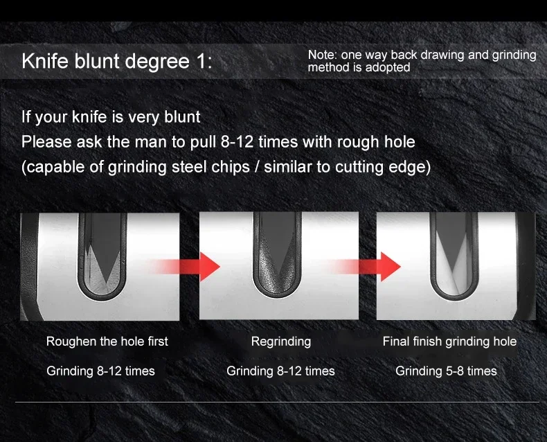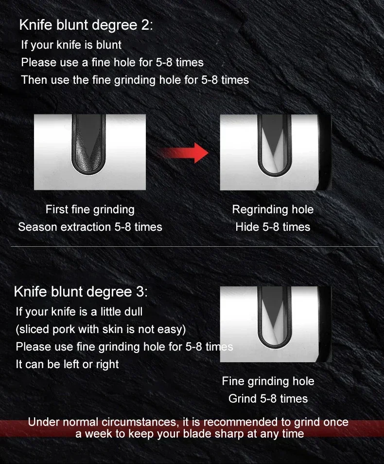 * Obtenez un tranchant rasoir en quelques secondes: donnez-lui quelques tirages appropriés à chaque fente dans une direction, et votre couteau sortira réinitialisé à la netteté d'usine. L'affûteur simple et infaillible satisfera la plupart des gens, et ils font tous le travail rapidement. Cela signifie que vous aurez toujours des couteaux tranchants, sûrs, efficaces et agréables à portée de main.