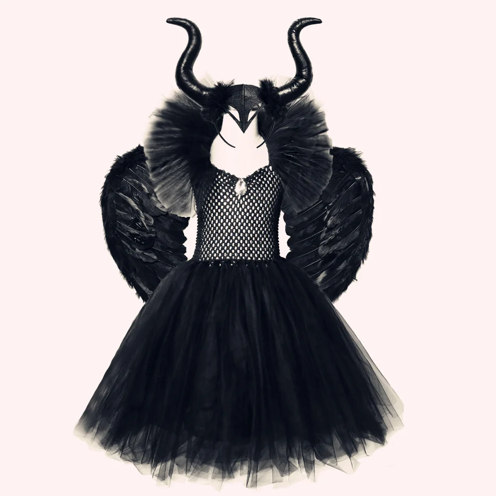 Costume sorcière fille – Robe tutu noire longue, ailes, cornes, Halloween
