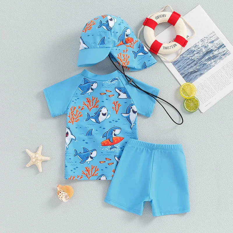 Ensemble de protection contre les éruptions cutanées pour bébés garçons, haut à manches courtes imprimé arbre de requin avec short et chapeau, maillot de bain d'étéPréparez vos tout-petits pour passer de bons moments avec nos maillots de bain.Ce maillot de bain est non seulement élégant mais aussi confortable pour vos petits aventuriers aquatiques.