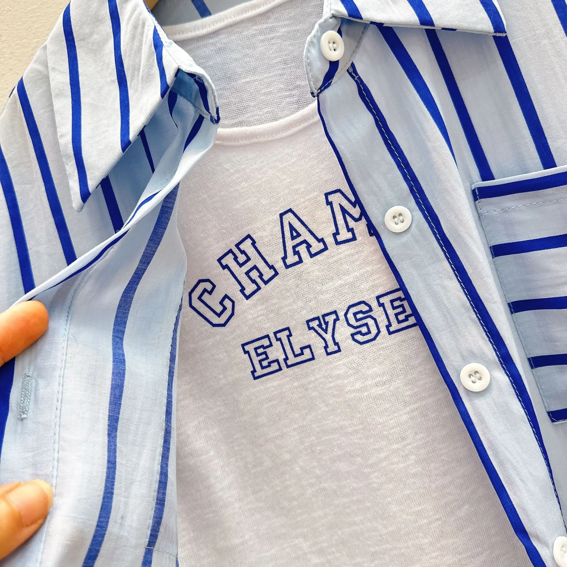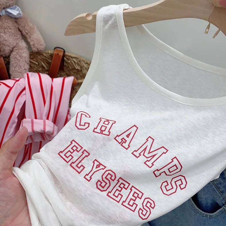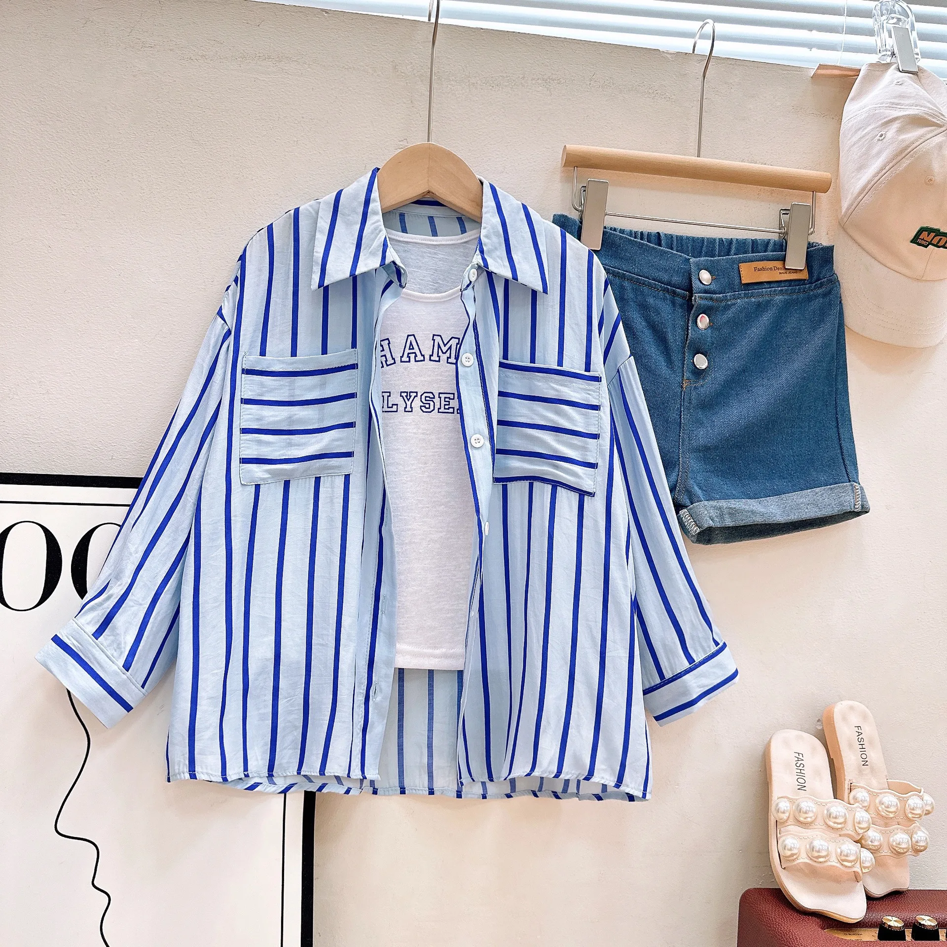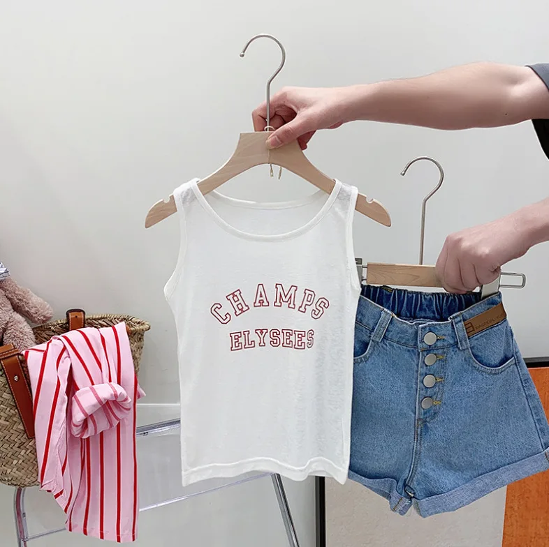 Ensemble été fille 3 pièces – chemise rayée, gilet lettres, short denim