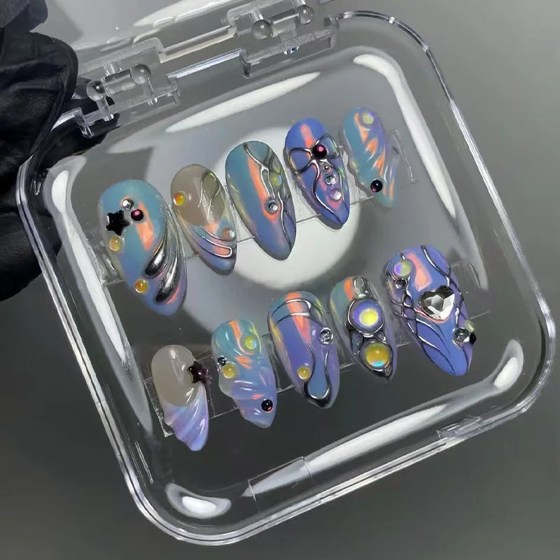 Faux ongles mi-longs noirs en amande, doux et frais, avec motif d'étoiles et de fleurs, à pression sur les pointes des ongles, manucure désignable, 24 pièces