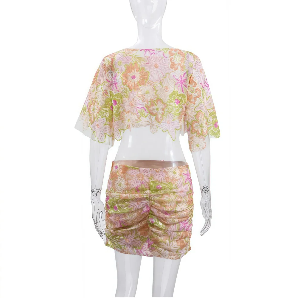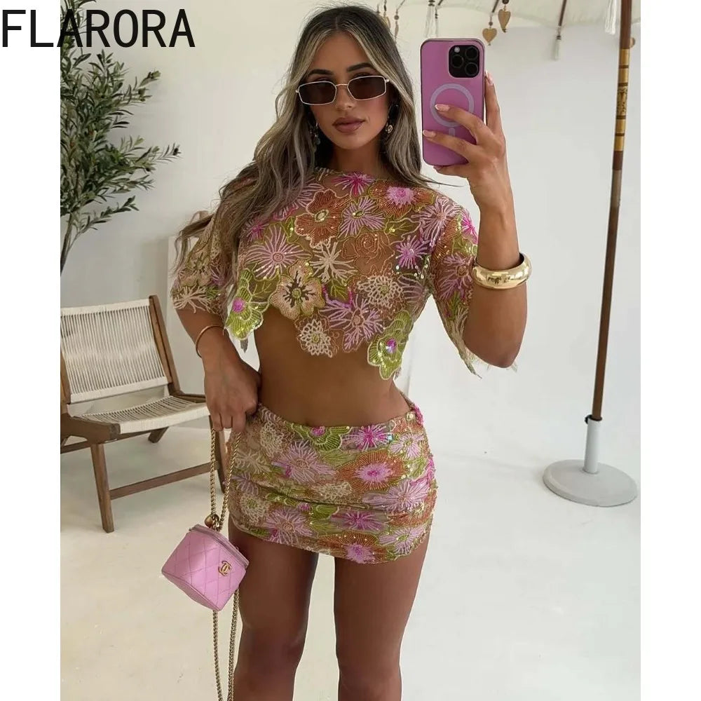 FLARORA Ensemble Femme Luxe 2 Pièces, Broderie & Paillettes, Haut Court & Jupe,