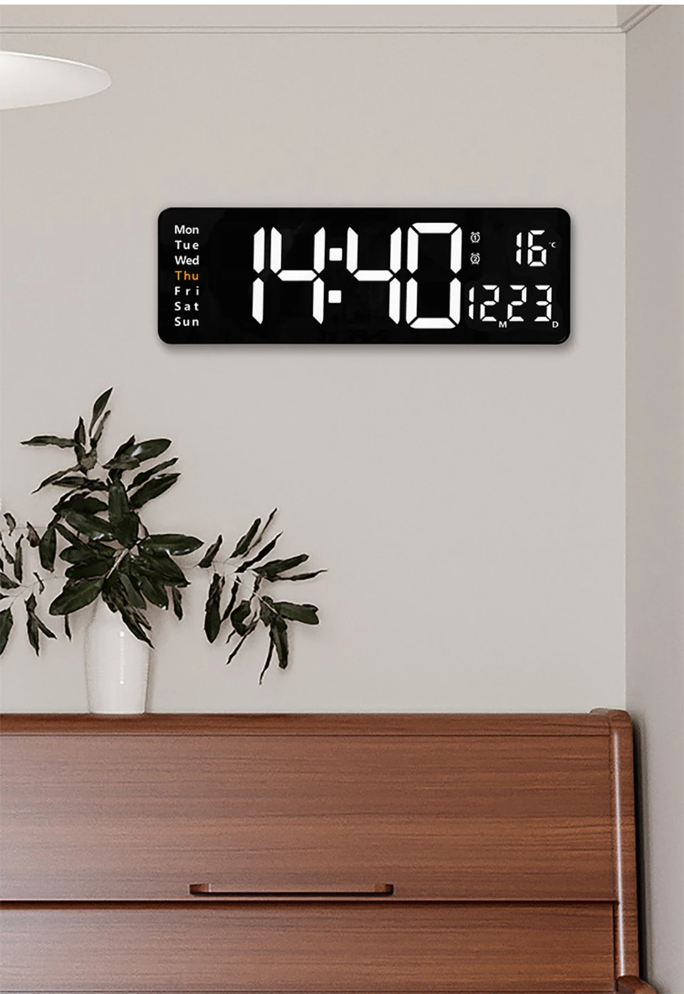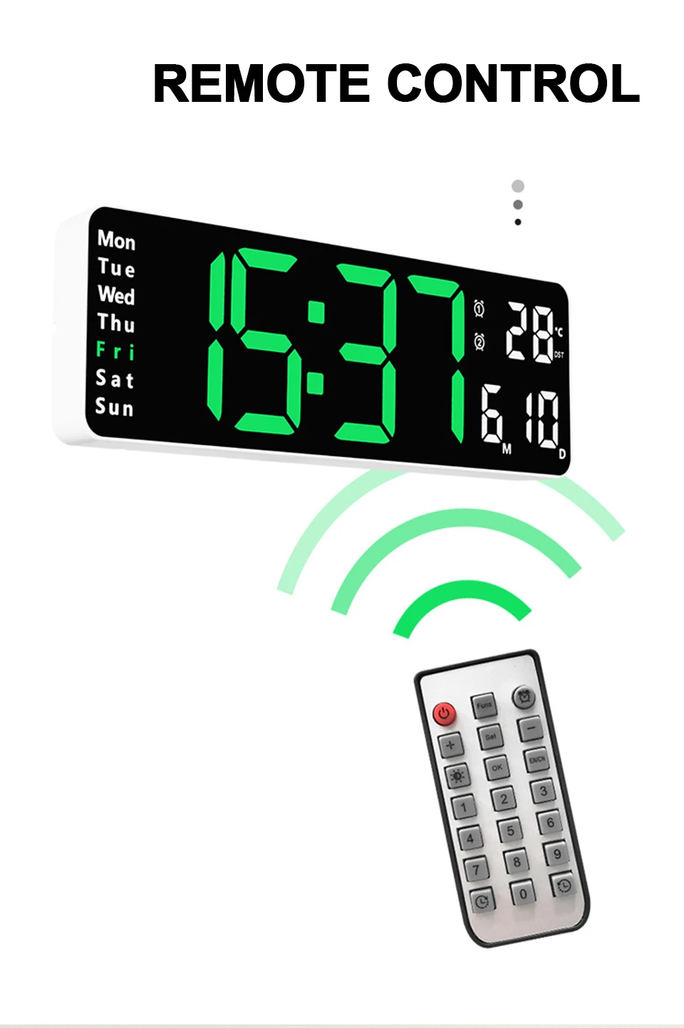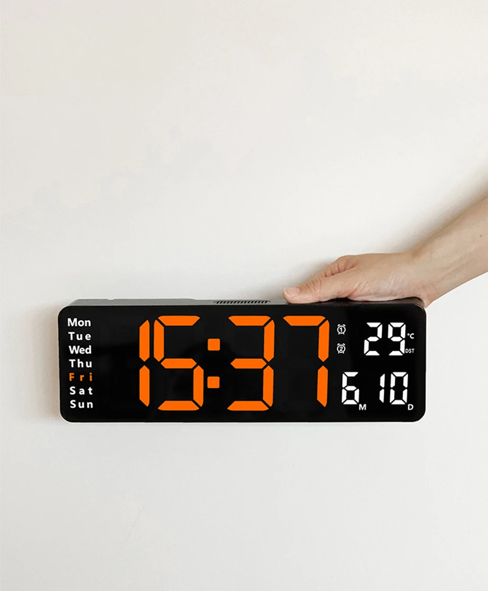 Horloge murale LED grande - télécommande, double alarme, température