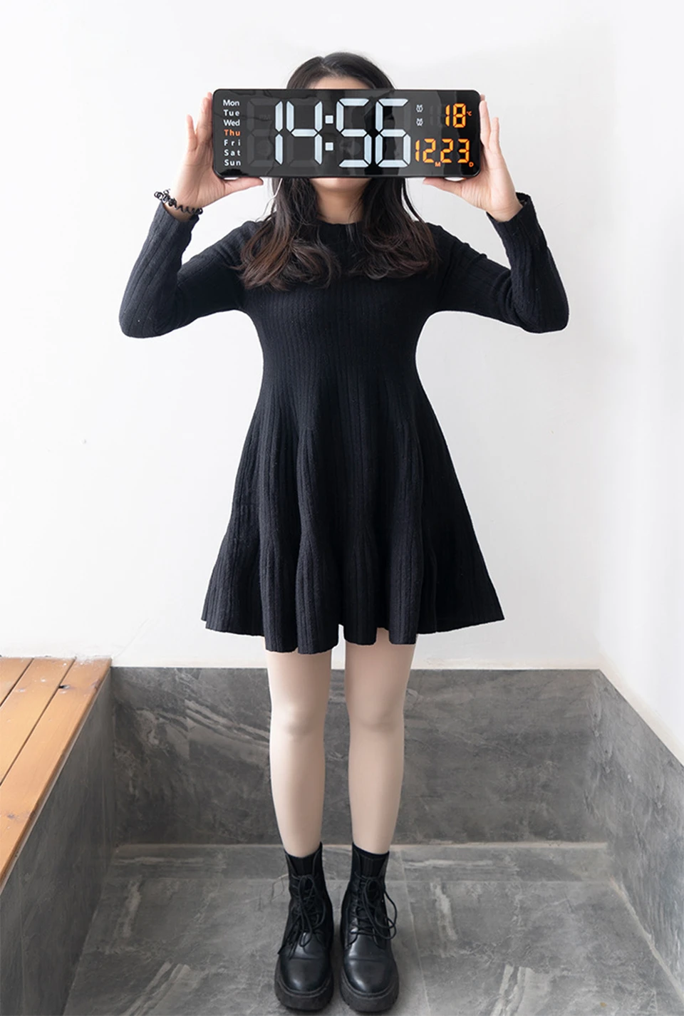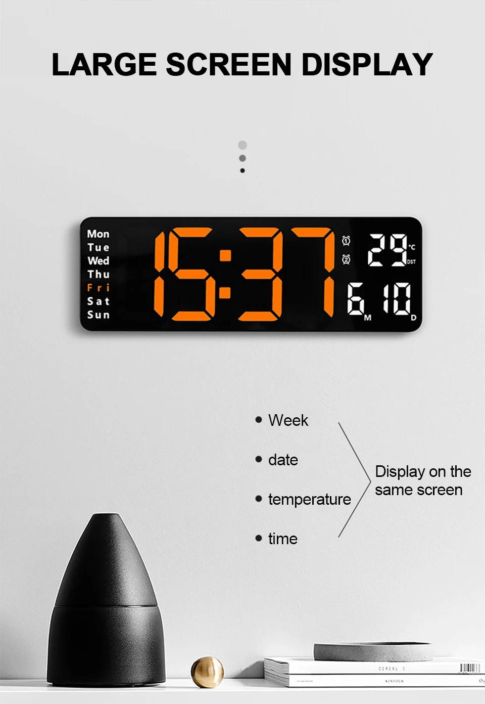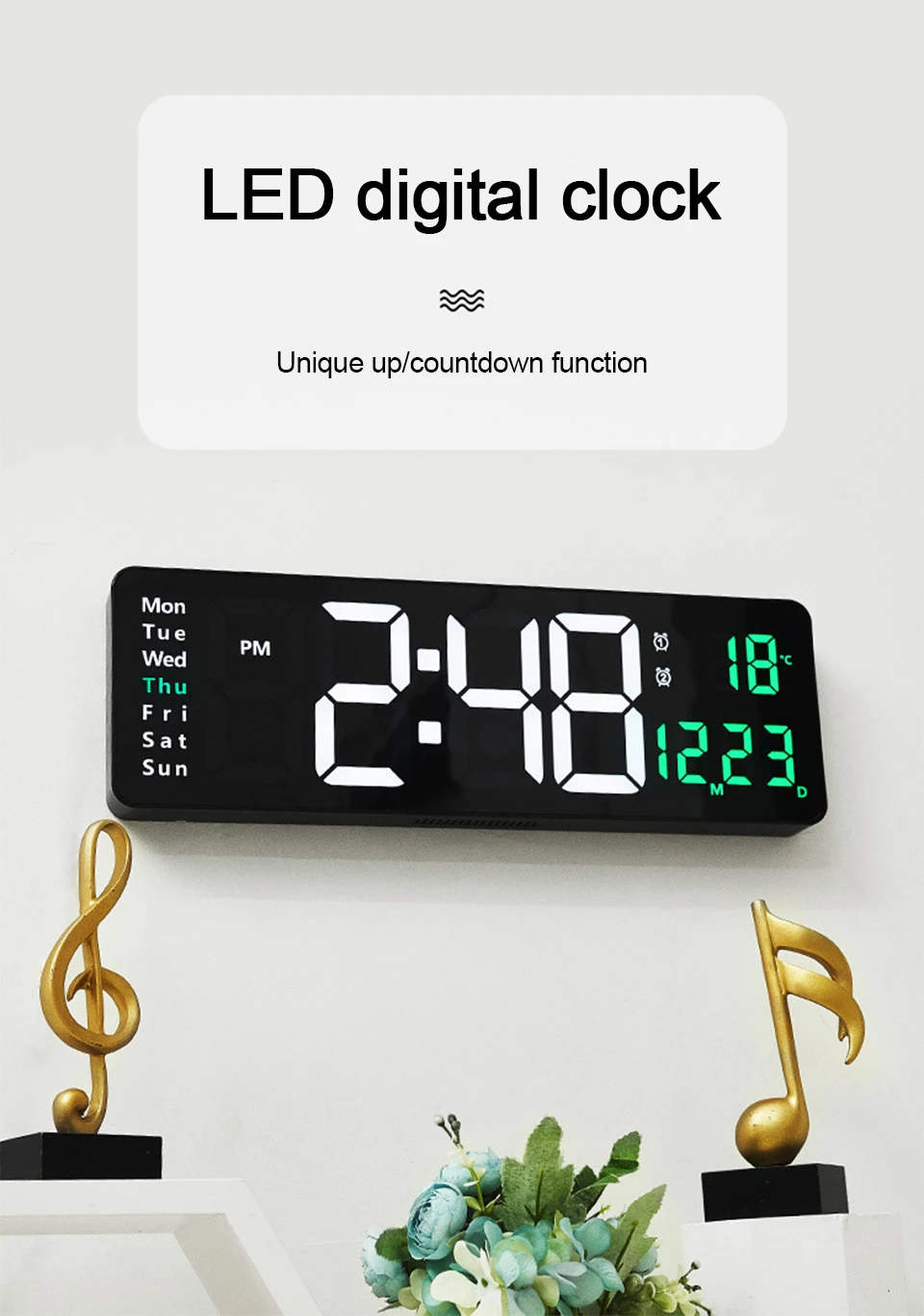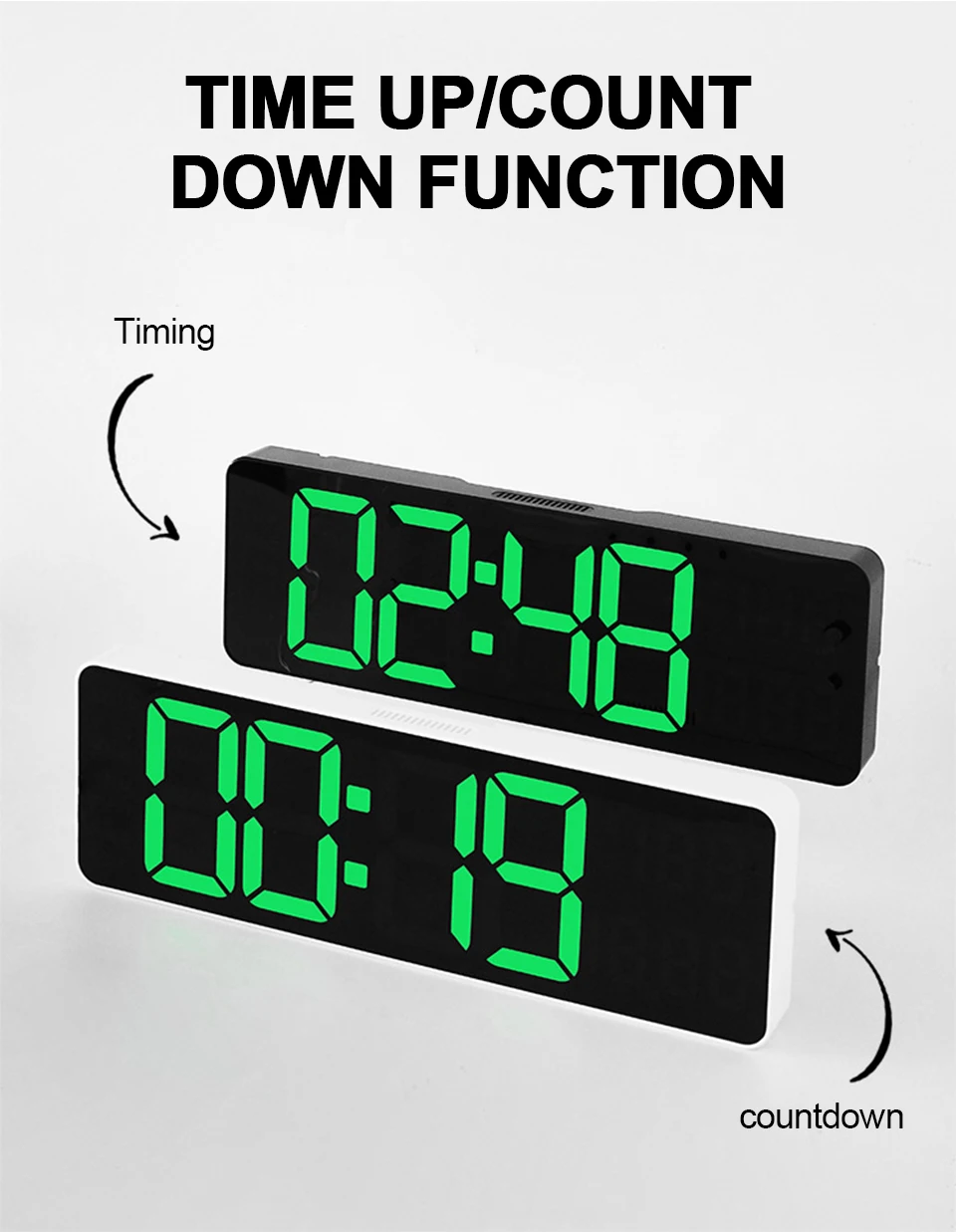 1. Grande horloge murale simple à LED, fonction avant/compte à rebours unique, peut également afficher l'heure/date/température/semaine sur le même écran.