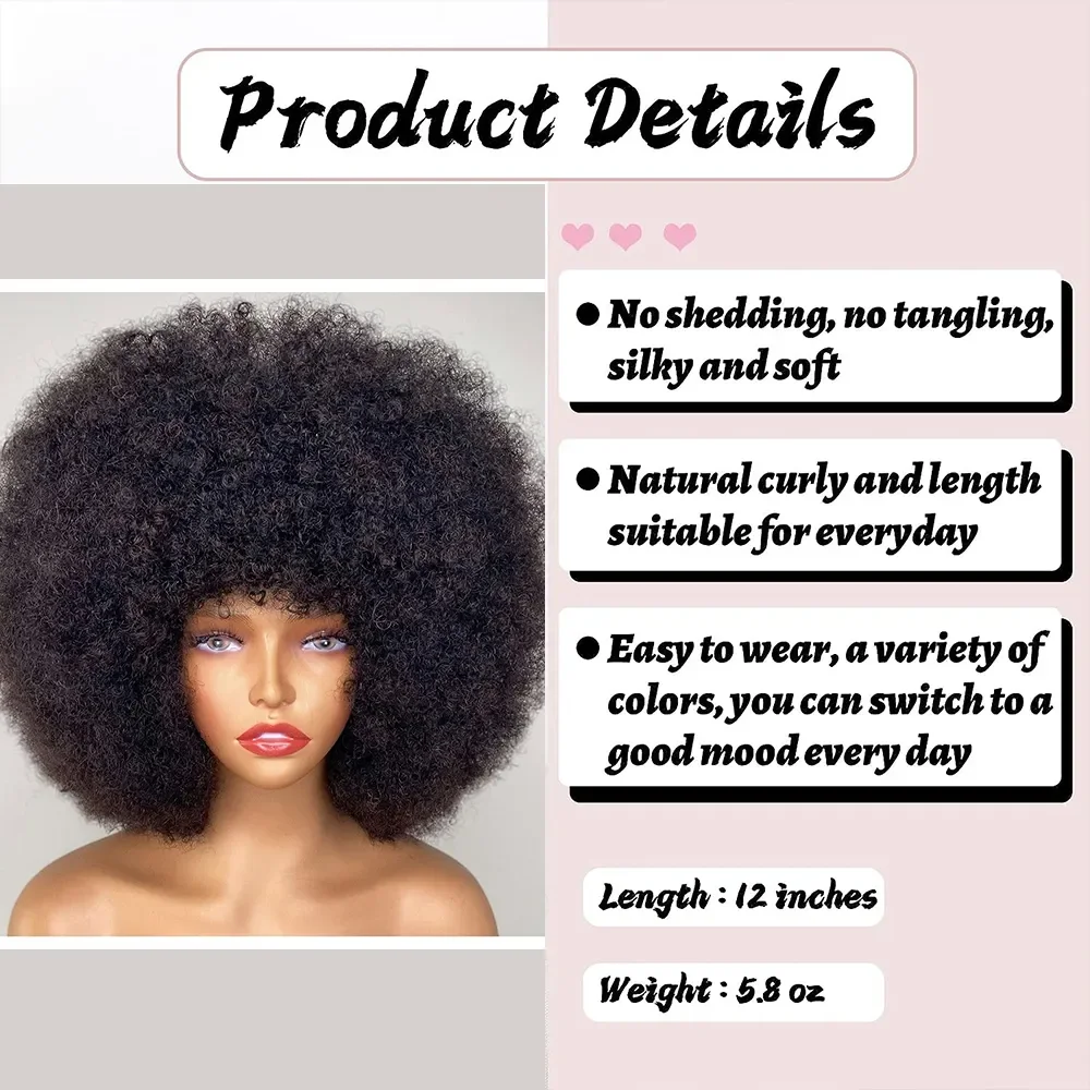 Perruques cheveux humains bouclés Afro courts avec frange – Perruques Bob naturelles, moelleuses, brésiliennes, 100% machine, densité 180%