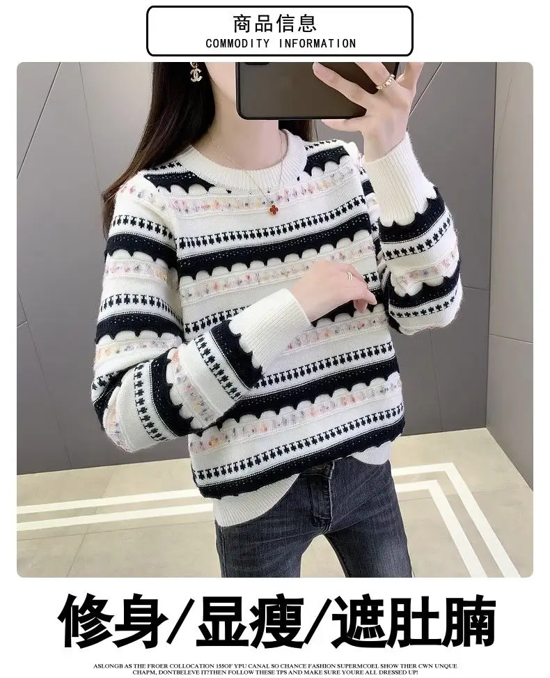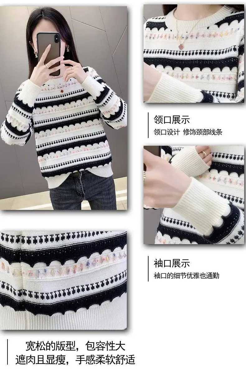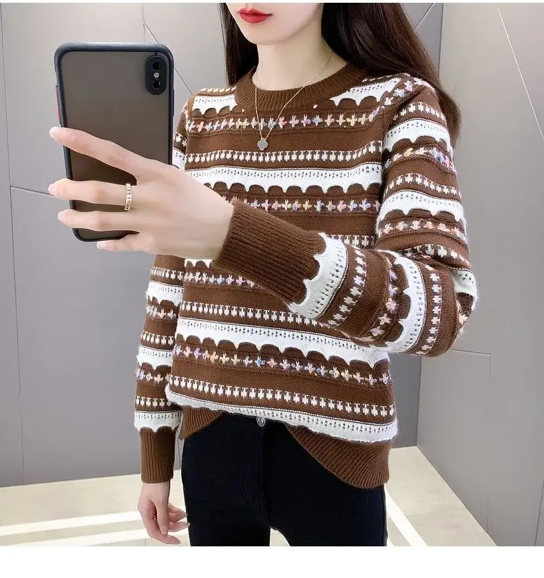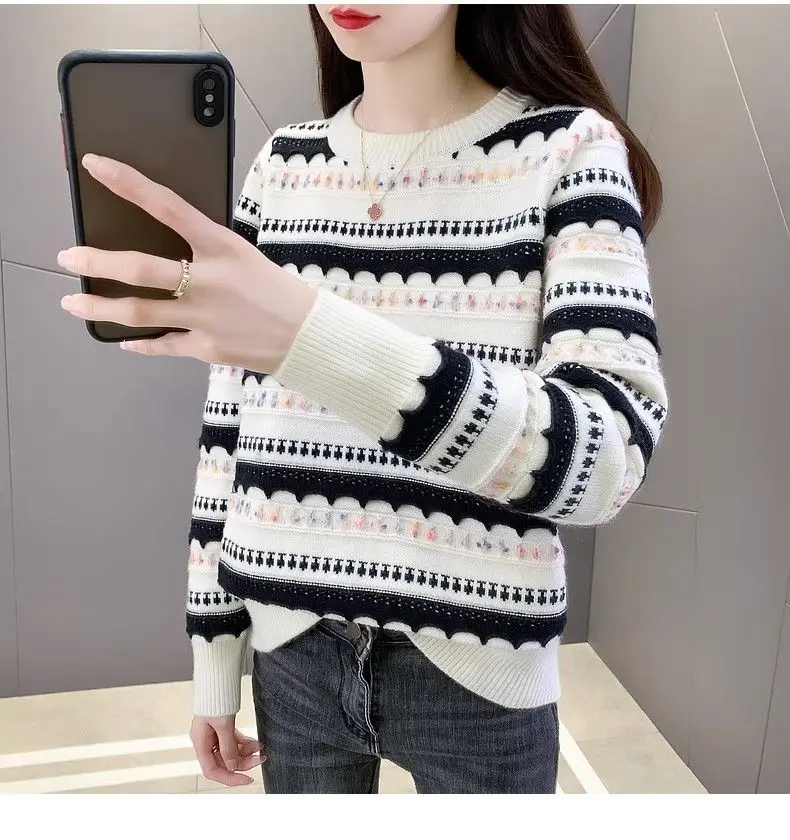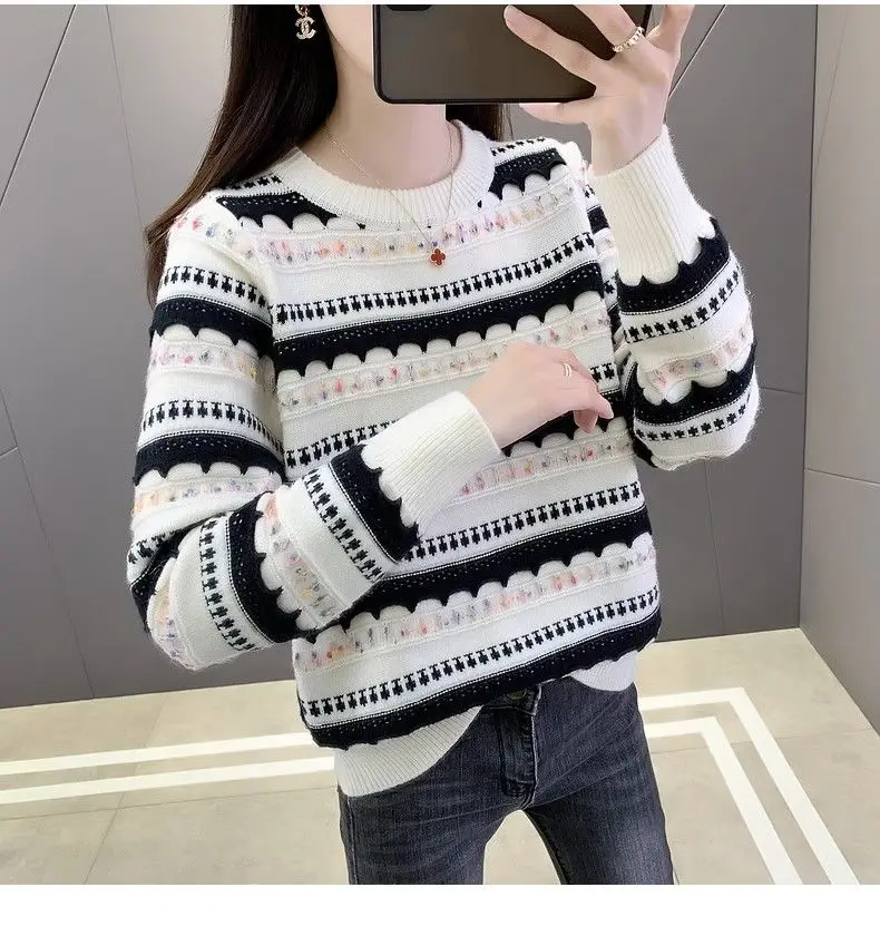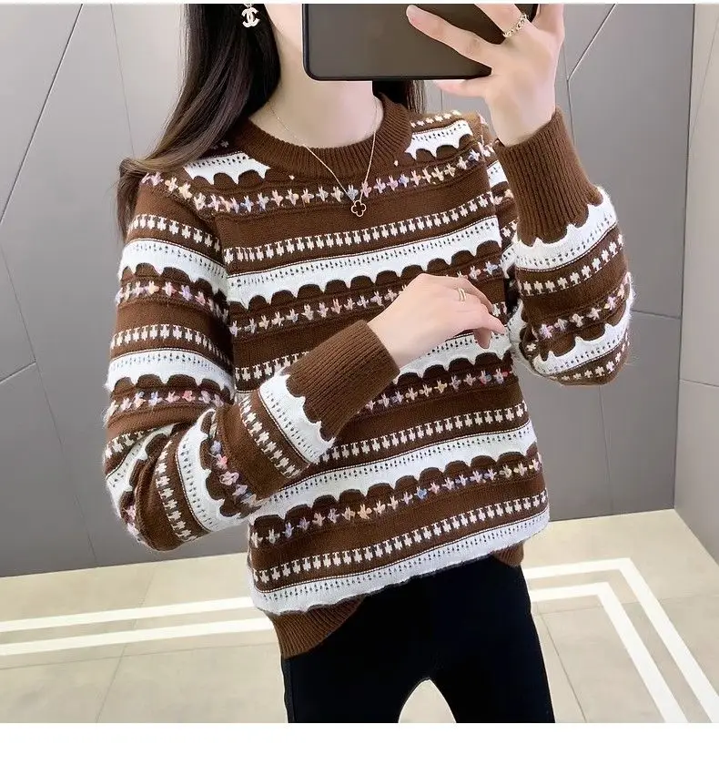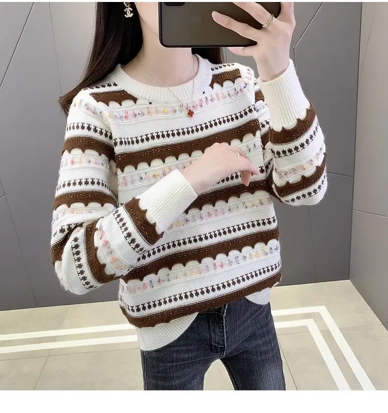 Pull femme col rond en peluche, style rayé automne-hiver