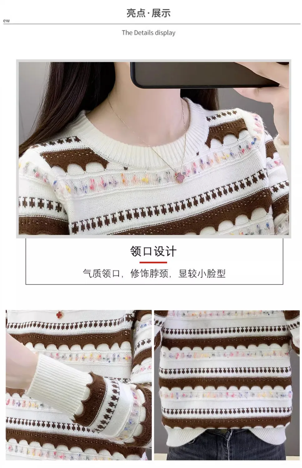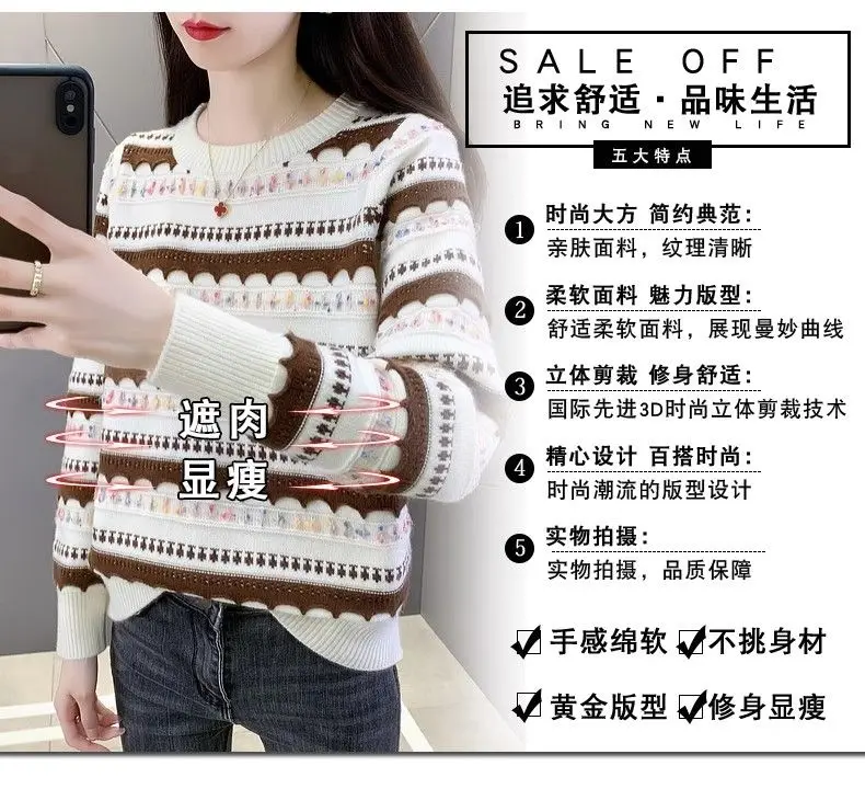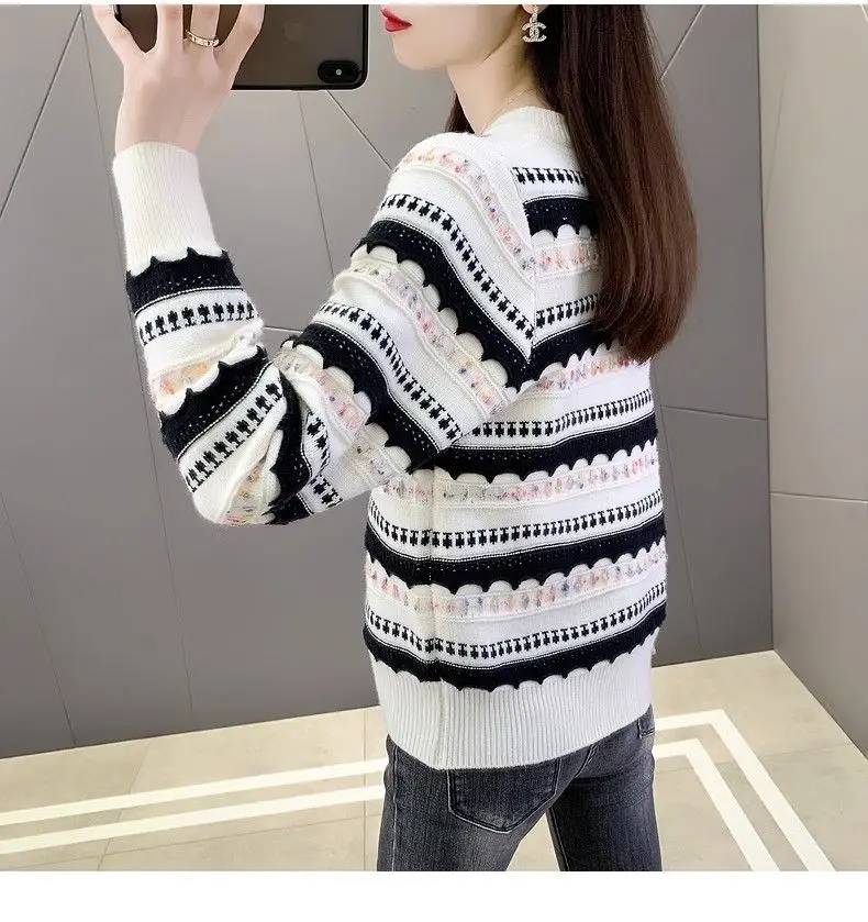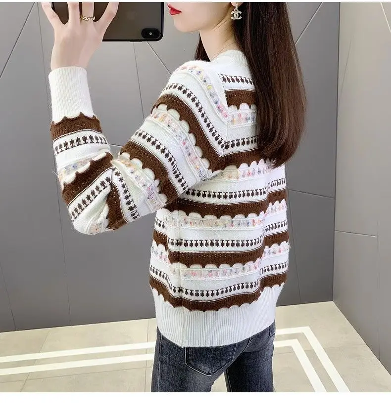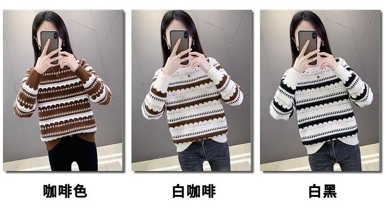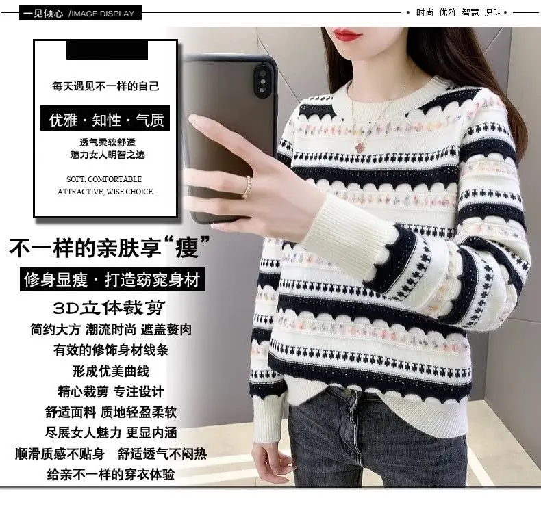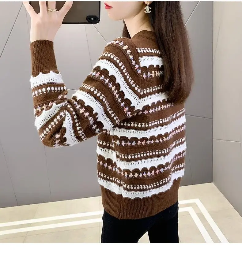 Pull femme col rond en peluche, style rayé automne-hiver