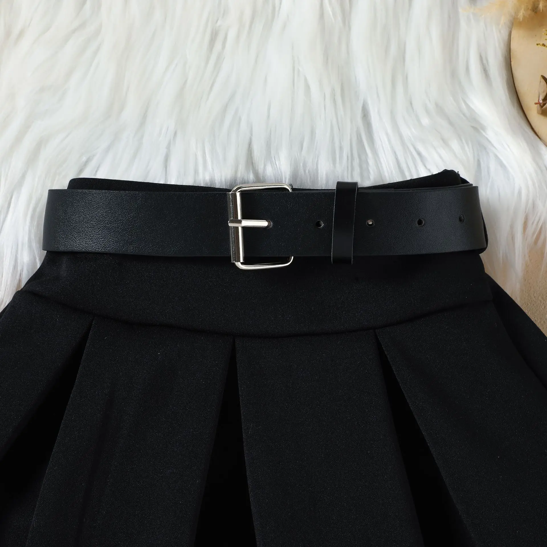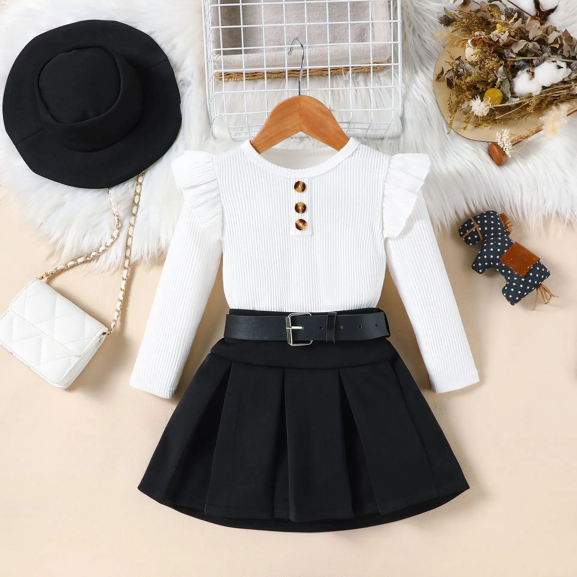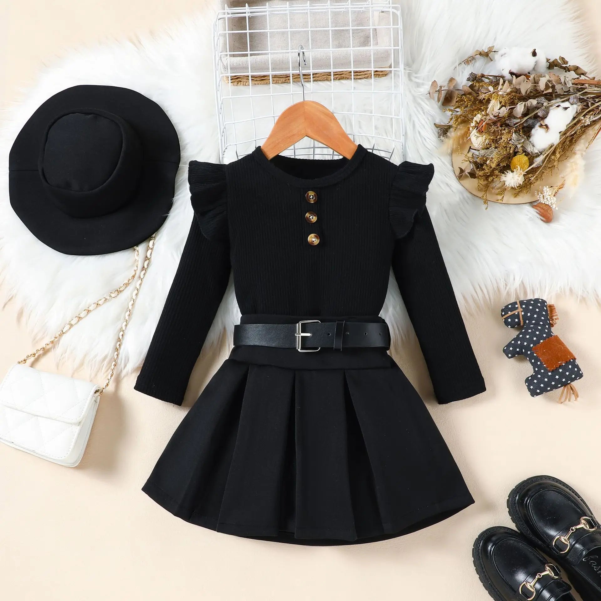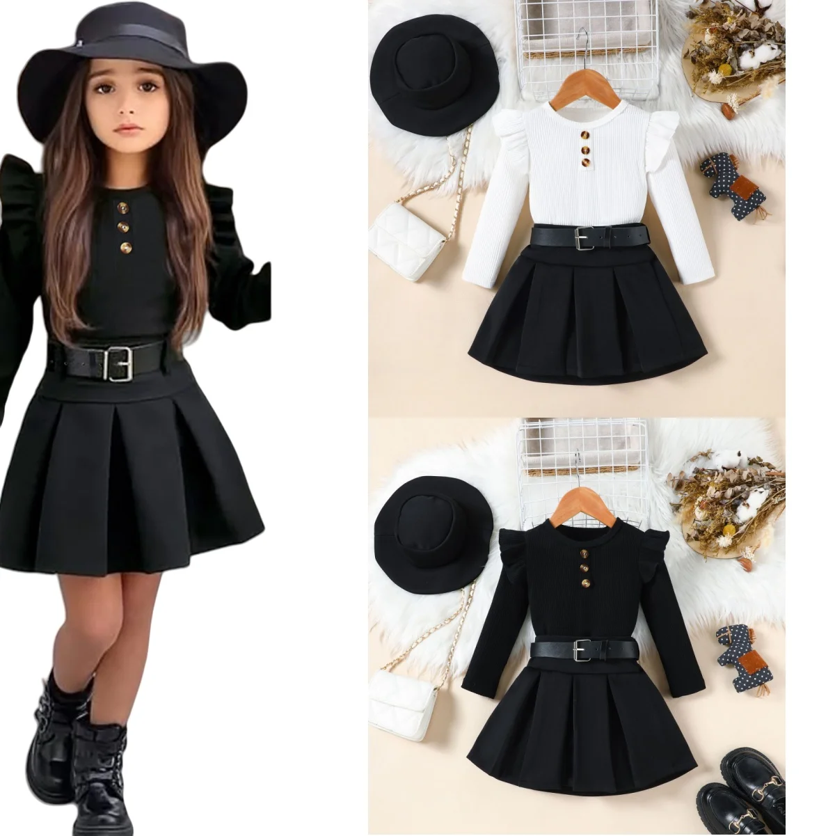 Ensemble fille 3 pièces automne/hiver – robe + ceinture + chapeau (2‑8 ans)