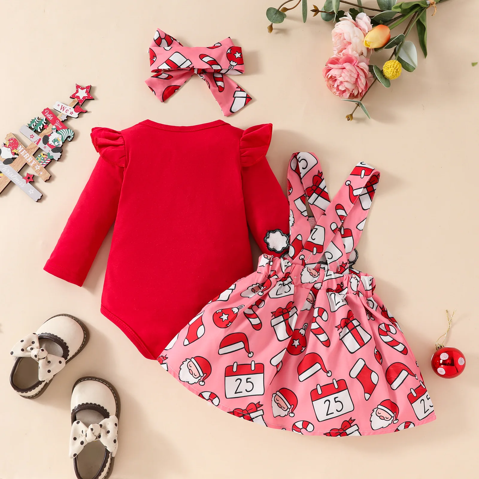 Ensemble Noël bébé fille 0‑18 mois – body imprimé, robe, bandeau