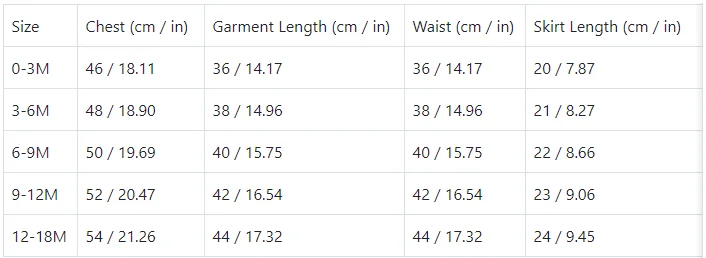 size_info: {"sizeInfoList":[{"length":{"cm":"46","inch":"18.11"},"size":"0-3M","vid":-1},{"length":{"cm":"48","inch":"18.90"},"size":"3-6M","vid":-2},{"length":{"cm":"50","inch":"19.69"},"size":"6-9M","vid":-3},{"length":{"cm":"52","inch":"20.47"},"size":"9-12M","vid":-4},{"length":{"cm":"54","inch":"21.26"},"size":"12-18M","vid":-5}]}